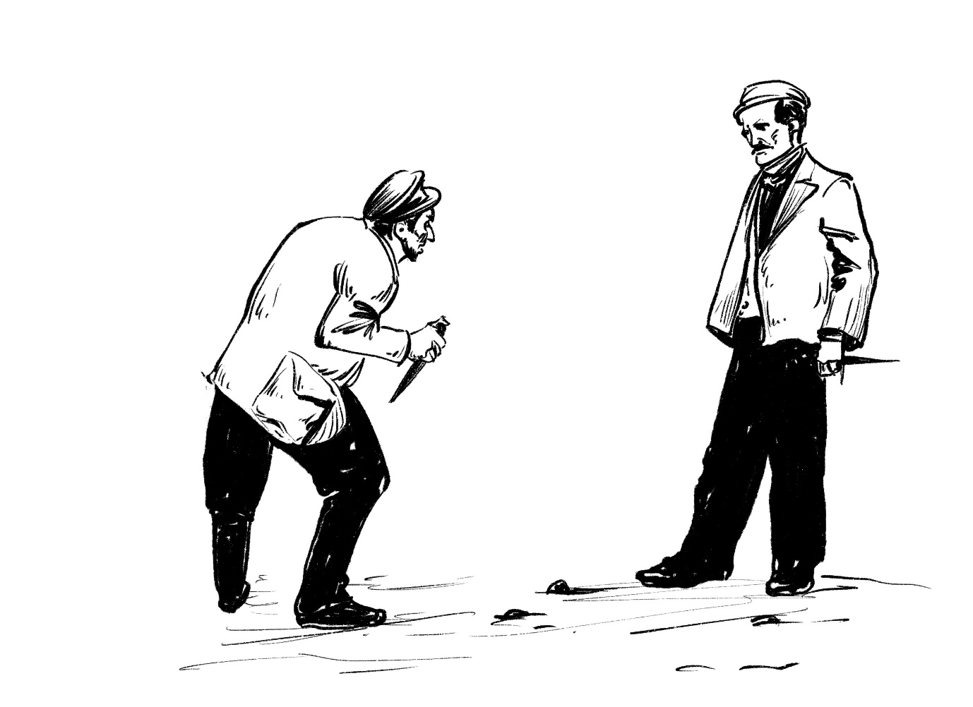 6. Дуэль на штырях или стилетах: данный вид дуэлей свойственен только каморристам. Стилет имеет свои особенности применения: у него отсутствуют режущие удары, производятся только горизонтальные пробивающие выпады. Использование стилетов больше свойственно для наемных убийц, то есть дуэли на стилетах происходят между убийцами.