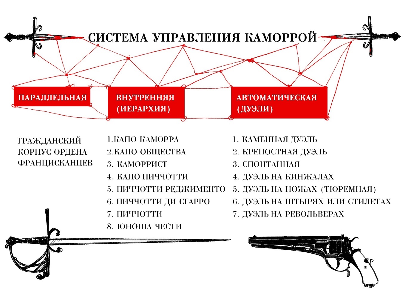 Значение дуэлей в Каморре разностороннее, как я уже отмечал – это некая автоматическая система, которая заставляла всех ее причастных упражняться, тренироваться в искусстве владения оружием, поскольку в любой момент каждого из них могли убить. Поэтому дуэли – это элементы и управления, и подготовки.