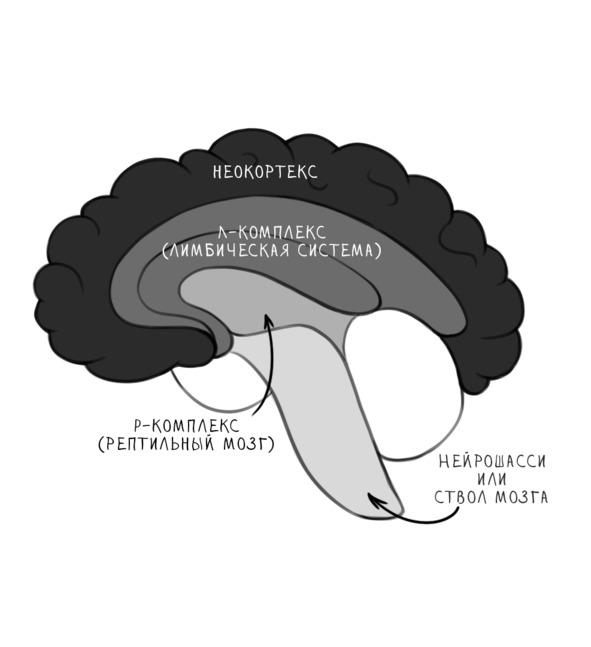 Когда на тренингах я объясняю, как устроены эволюционные слои мозга, то обычно рисую такую схему. На ней отображены основные из них.