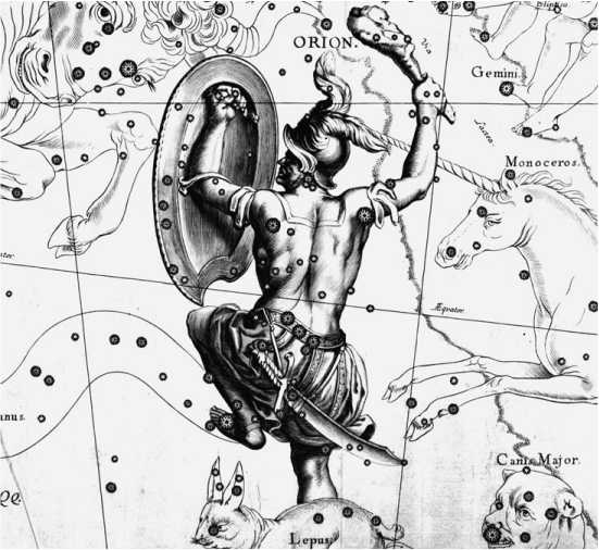 Орион, великан-охотник, обидчик Опиды. Илл. из атласа Яна Гевелия «Уранография» (Гданьск, 1690)