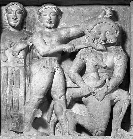 Персей, покровительствуемый Афиной, отсекает голову горгоне Медузе. Фрагмент рельефа из храма в Селинунте (Сицилия), середина VI в. до н. э.