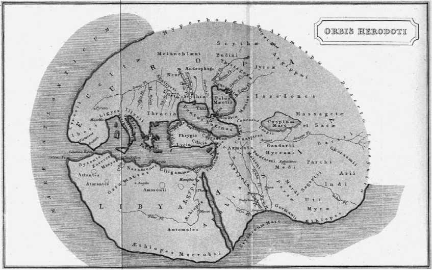 Геродотова карта мира во многом основывалась на сведениях из поэмы Аристея «Аримаспея». На территории современной Украины Геродот обнаруживает племена дикарей-андрофагов («людоедов») Илл. из «Атласа античной и классической географии» Сэмюэла Батлера (1907)