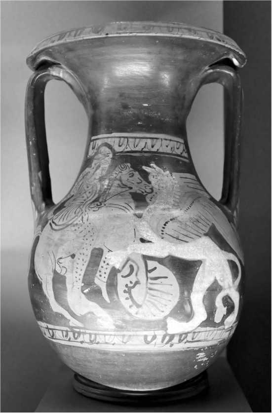 Аримасп, сражающийся с грифоном. Аттическая краснофигурная пелика в керченском стиле, 375–350 гг. до н. э.