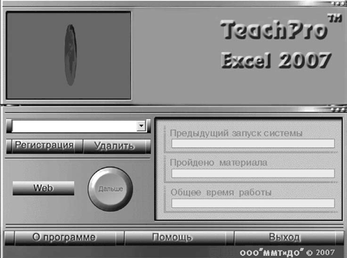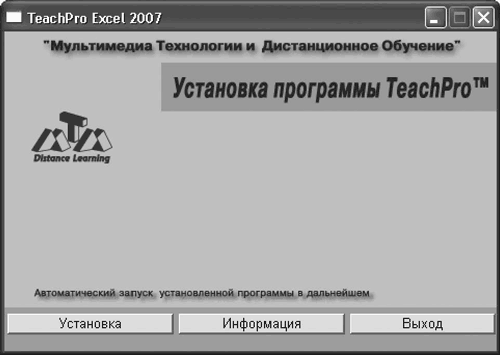 Чтобы установить мультимедийный курс TeachPro Excel 2007, вставьте диск в привод вашего персонального компьютера. Затем откройте любым известным вам способом содержимое компакт-диска, найдите и запустите файл teachrun.exe. Появится окно установки (рис. 01).