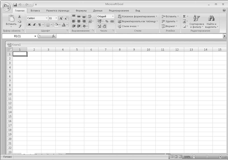 Выше расположена так называемая лента – новый элемент интерфейса программы Excel 2007. На ней имеются различные кнопки, раскрывающиеся списки и флажки, которые вы будете использовать для осуществления различных операций.