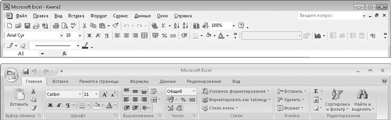 Начнем рассмотрение интерфейса с ленты, поскольку, как говорилось ранее, данная область окна программы претерпела существенные изменения по сравнению с предыдущими версиями Excel. Сверху на рис. 1.2 изображена верхняя часть окна программы Excel XP (2002), а снизу – Excel 2007.