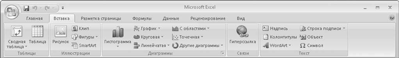 Обратите внимание, лента содержит вкладки. Ярлыки вкладок вы видите над лентой (Главная, Вставка, Разметка страницы, Формулы, Данные, Рецензирование и Вид). Попробуйте щелкнуть кнопкой мыши на любом ярлыке, например Вставка. Вид ленты изменится (рис. 1.3). Теперь на ней расположены совершенно другие кнопки и элементы управления, которые так или иначе относятся к командам вставки. С их помощью вы можете вставить в документ таблицу, рисунок, диаграмму и т. д.