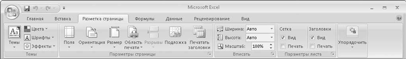 Теперь щелкните кнопкой мыши на вкладке Разметка страницы (рис. 1.4). Вид ленты снова изменился. Теперь стали доступными элементы управления для изменения вида страницы, настройки ее ориентации, задания областей печати и т. д.