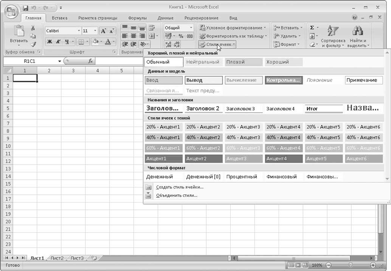 В данной галерее вы видите доступные стили, которые можно применить к выделенным ячейкам. Стиль включает в себя цвет ячейки, шрифт текста, а также формат данных. Помимо графических образцов галерея содержит также две команды (эти команды расположены в нижней части галереи). Названия команд достаточно информативны: вы можете создать собственный стиль (который также будет помещен в галерею) или объединить несколько стилей.