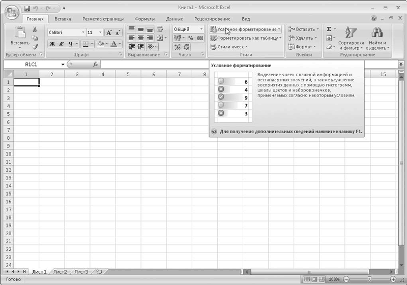 Каждый элемент управления ленты снабжен достаточно подробной всплывающей подсказкой. Подведите указатель мыши к кнопке Условное форматирование в группе Стили вкладки Главная. Появится всплывающая подсказка, содержащая не только текстовую, но и графическую информацию (рис. 1.6).