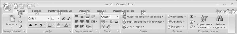 1. Нажмите клавишу Alt. Обратите внимание, что под ярлыками вкладок, кнопками Панели быстрого доступа и на Кнопке «Office» появились квадратики с буквами. Например, вкладка Вставка обозначена буквой С (рис. 1.7).
