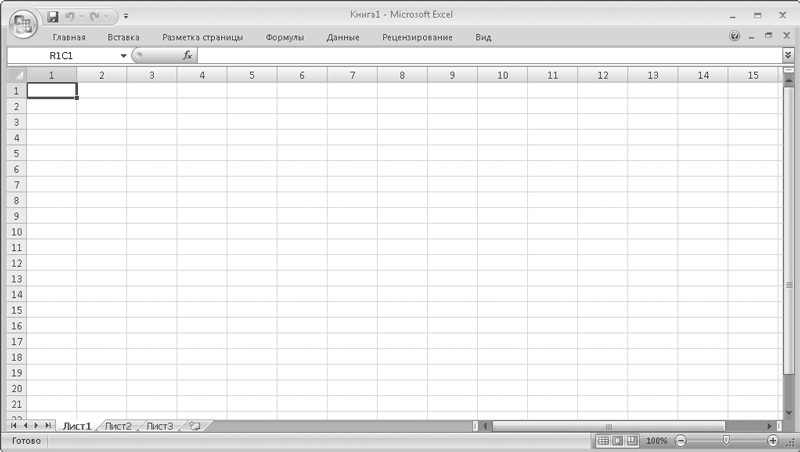 Основную часть главного окна (рис. 1.1) программы Excel занимает так называемый лист – белая область, разделенная на прямоугольные ячейки. Это и есть ваша рабочая область, то есть область создаваемого или редактируемого документа. Чуть позже мы познакомимся с листом поближе.