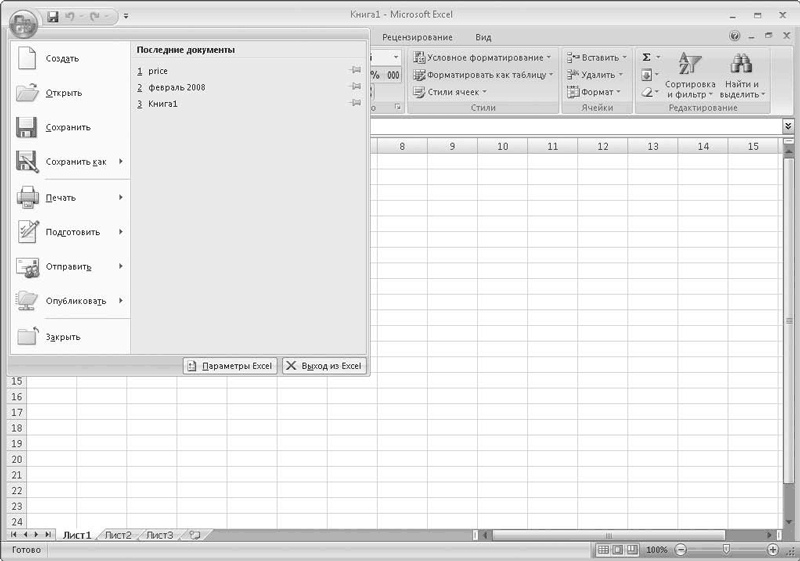 Кроме того, новшеством в Excel 2007 является круглая кнопка, расположенная в левом верхнем углу окна программы, которая называется Кнопка «Office». Она вызывает меню с некоторыми важными командами, такими как открытие, сохранение или создание файла, печать и т. д.