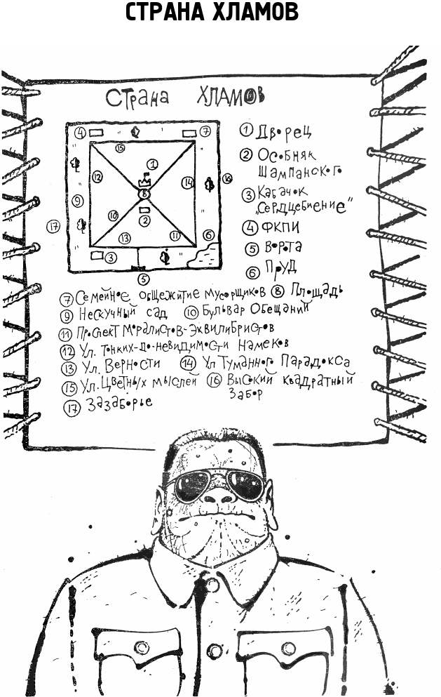 Мусорщиками назывались хламы весьма далёкие от парапсихологии и других утончённых наук, буйно процветающих на границе разума и таинственных глубин подсознания. Возможно, поэтому они занимались самой простой физической работой: прибирали захламлённые за день улицы, ремонтировали старые постройки, варили «Горькую полынь», а также чеканили осьмаки – монеты с изображением нынешнего правителя Хламии Верени Водаёта на одной стороне и Высокого квадратного забора на обороте. И хотя эти осьмаки согласно закону должны были распределяться между хламами в зависимости от направления ветра и цвета глаз, большая часть их оседала почему-то в карманах профессоров ФКПИ, богемовцев, хламов, близких по духу к богемовцам, и других аристократов. Поэтому ясно, как обрадовались мусорщики, когда незнакомый хлам, одетый в простой полувоенный френч, выкатил им дармовую бочку «Горькой полыни». Такое случалось нечасто, а возможно, и впервые в истории Государства Хламского.