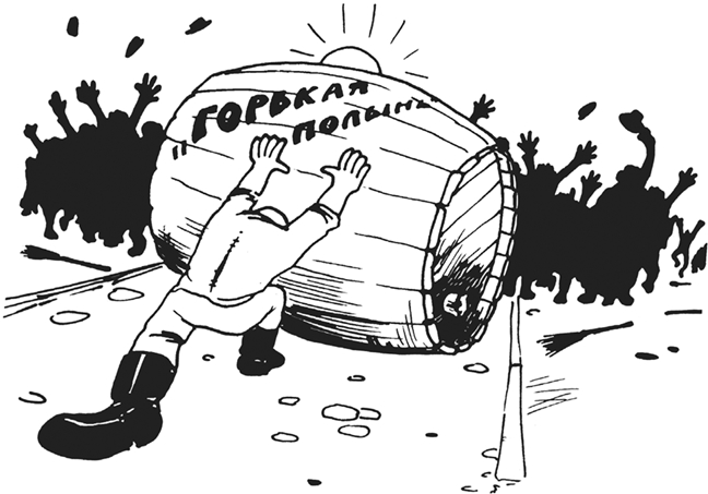 В прихожей кабачка незнакомец в полувоенном френче лёгким движением вскинул на спину бочку «Горькой полыни» и, оттолкнув к стене ошеломлённого кабатчика Лажбеля, вышел вон. На улице он согнал с губ жестокую улыбку, пригасил угрожающий блеск своих непроницаемо-чёрных очков и, немилосердно толкая встречных хламов и хламок, строевым шагом двинулся к Семейному общежитию мусорщиков.