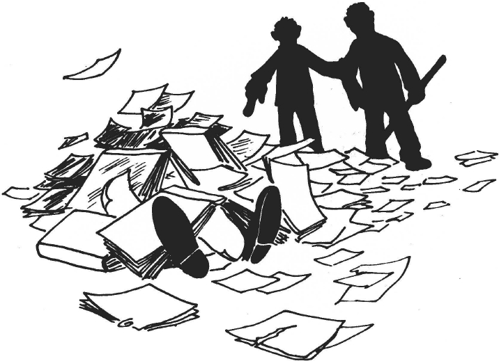 Во время обыска никто из мусорщиков, естественно, не догадался бы искать писателя в куче книг, беспорядочно сваленных в одной из комнат его просторного особняка. И, скорее всего, его так бы и не нашли, если бы одному из мусорщиков не захотелось покурить. Он вытащил из груды книг, под которой спрятался знаменитый писатель, один из его романов, выдернул страницу, свернул козью ножку и, прикурив, по слогам прочитал: «Смешно только мне» – заглавие объёмистого романа, который держал в руках. Затем перевёл заинтересованный взгляд на высившуюся перед ним груду.