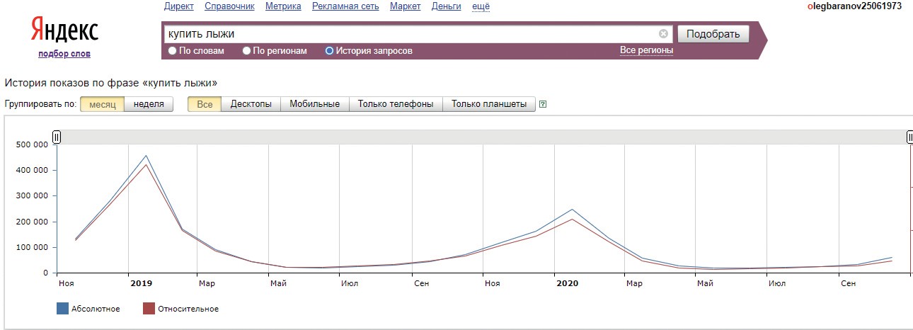 Рис. 2. Просмотр статистики запроса «Купить лыжи»