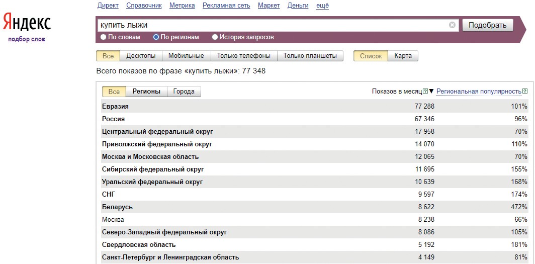 Рис. 4. Просмотр статистики запроса «Купить лыжи» по регионам