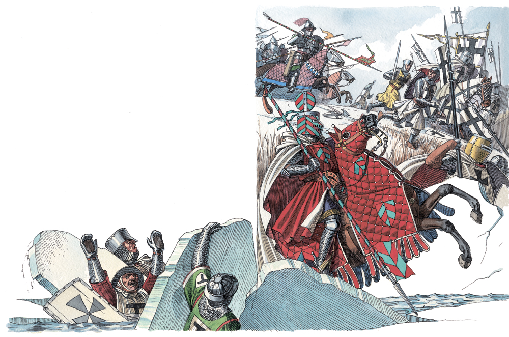Сеча кругом шла такая, что льду озёрному стало жарко. Страх взял псов-рыцарей – видят, что теснят их русские со всех сторон. Тяжёлым конникам не развернуться в давке, не вырваться. А тут ещё пустили русские в ход крюки на длинных шестах. Подцепят крюком рыцаря и с коня сбрасывают.