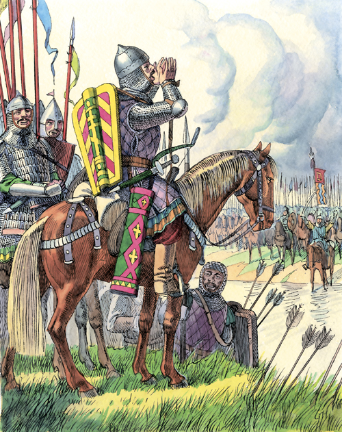 Известно было, что крестоносцы выстраивали своё войско острым клином. Впереди ряд за рядом двигалась тяжёлая, закованная в латы, конница. Сомкнуты щиты, выставлены длинные копья. Потом шли конники в более лёгких доспехах. За ними – пешие рыцари.