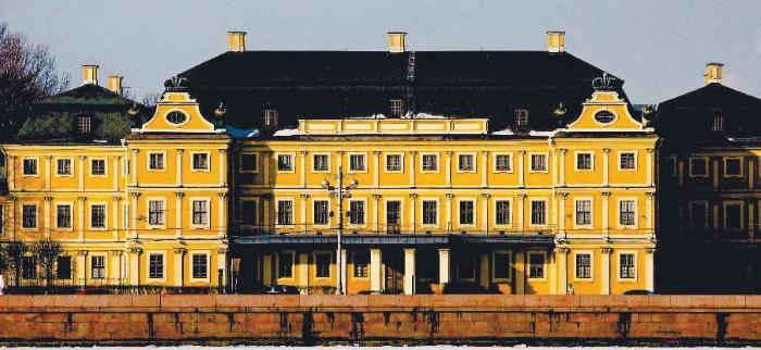 Симметричную композицию имеет и Меншиковский дворец, построенный для генерал-губернатора его личным архитектором Иоганном Готфридом Шеделем при участии Карло Фонтаны и Доменико Трезини. Сегодня дворец кажется скромным, но в петровское время это была жемчужина Санкт-Петербурга. Главный вход подчеркивало высокое крыльцо. Над ним – фронтон замысловатых очертаний с гербом «Светлейшего». Флигели тоже были украшены фронтонами в виде затейливых княжеских корон. От парадного входа к Неве вела широкая мраморная лестница с изящными перилами и просторными площадками. В хорошую погоду они служили местом ассамблей. Интерьеры дворца были отделаны богато и со вкусом. Не случайно в особо торжественных случаях император устраивал приемы не в своем, а в Меншиковском дворце. Шедель и Фонтана окрасили дворец не в традиционный красно-белый, а в серый цвет, имитируя с помощью штукатурки трещины и замшелости – воплощение барочной идеи «memento mori». Как будто неумолимое время наложило отпечаток на старинное родовое гнездо безродного Меншикова.