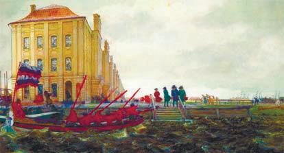 Работы Евгения Евгеньевича Лансере представляют Петербург как морскую столицу. Ее символы – свежий ветер, холодные воды Невы и Балтики под пасмурным небом, изощренные формы судов и здание Двенадцати коллегий с фронтонами в виде корабельной кормы.
