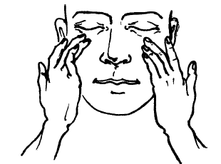 Далее следует сделать легкий массаж. Закрыв глаза, осторожно, без нажима, растирающими движениями массируйте средними пальцами кожу нижних век. Длительность массажа – 1 5-20 секунд (рис. 2).
