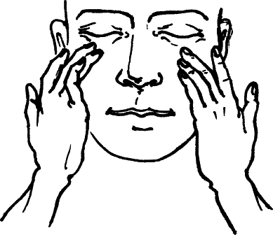 Далее следует сделать легкий массаж. Закрыв глаза, осторожно, без нажима, растирающими движениями массируйте средними пальцами кожу нижних век. Длительность массажа – 15–20 секунд (рис. 2).