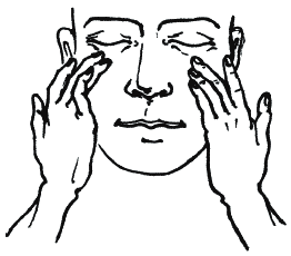 После ванночки закрыть глаза и осторожно, без нажима, растирающими движениями 15–20 секунд помассировать средними пальцами кожу нижних век (рис. 2).