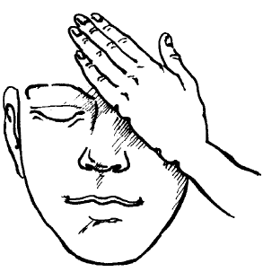 Исходное положение: сидя в удобной позе, выпрямите пальцы левой руки и положите ее ладонью на закрытый левый глаз. Локоть несколько отведен влево, пальцы лежат на лбу и немного повернуты вправо (рис. 7).