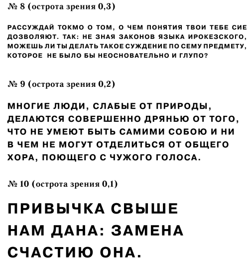 Упражнение 1. Из приведенных ниже отрывков определите самый мелкий шрифт, который можете читать свободно, без усилий на расстоянии 20–30 см (рис. 9, 10).