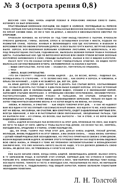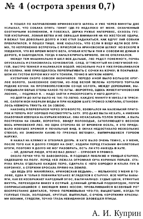 Упражнение 2. Выберите из приведенных выше отрывков самый мелкий шрифт, который можете читать свободно, без усилий на расстоянии 20–30 см. Если возникла необходимость читать с очками, то первоначально можете воспользоваться ими. Через некоторое время, когда зрение улучшится, надо будет снимать очки во время чтения. Если вы испытываете неприятные ощущения при чтении мелкого шрифта, немедленно прекратите упражнение. Дискомфорт свидетельствует о наличии напряжения, то есть о неправильном использовании вами своих глаз. В следующий раз начните читать более крупный шрифт. Текст читать 10–15 минут на расстоянии 20–30 см. Постепенно вы сможете читать без усилий все более мелкий шрифт. Время чтения, если вы не испытываете напряжения глаз, можно увеличить до 20–30 минут. Упражнение особенно рекомендуется близоруким.