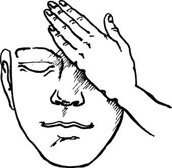 Исходное положение: сидя в удобной позе, выпрямите пальцы левой руки и положите ее ладонью на закрытый левый глаз. Локоть несколько отведен влево, пальцы лежат на лбу и немного повернуты вправо (рис. 7).