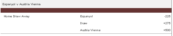 Здесь мы возьмем вилку на матч Espanyol против Austria Vienna. Общая сумма ставки в 1000 рублей делится таким образом.