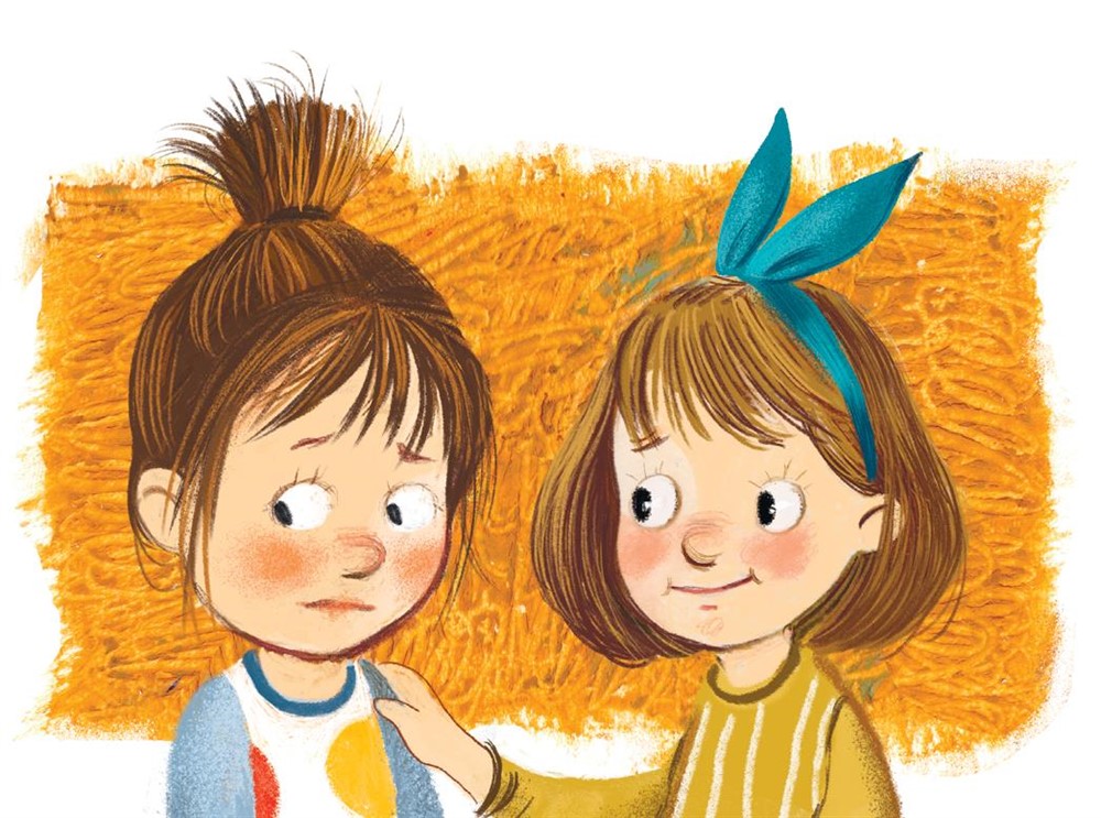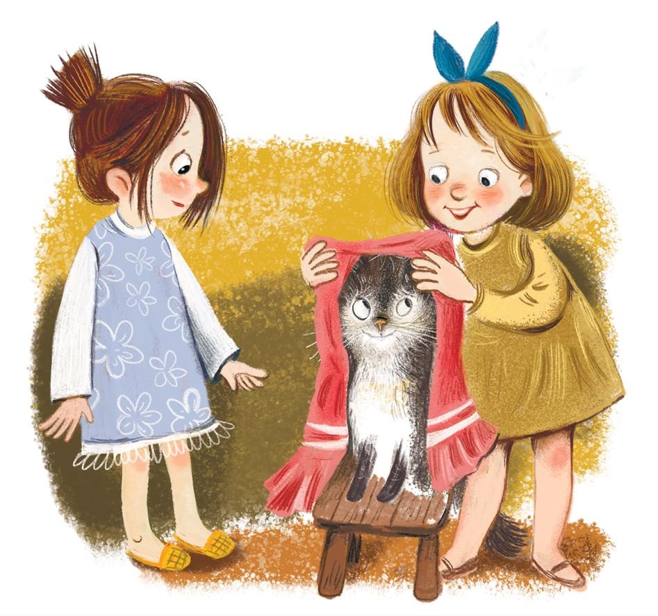 Маша улыбается, а Ойка в сторону глядит, отворачивается. Стыдно ей, что она не хотела на руки брать мокрую Мурку.