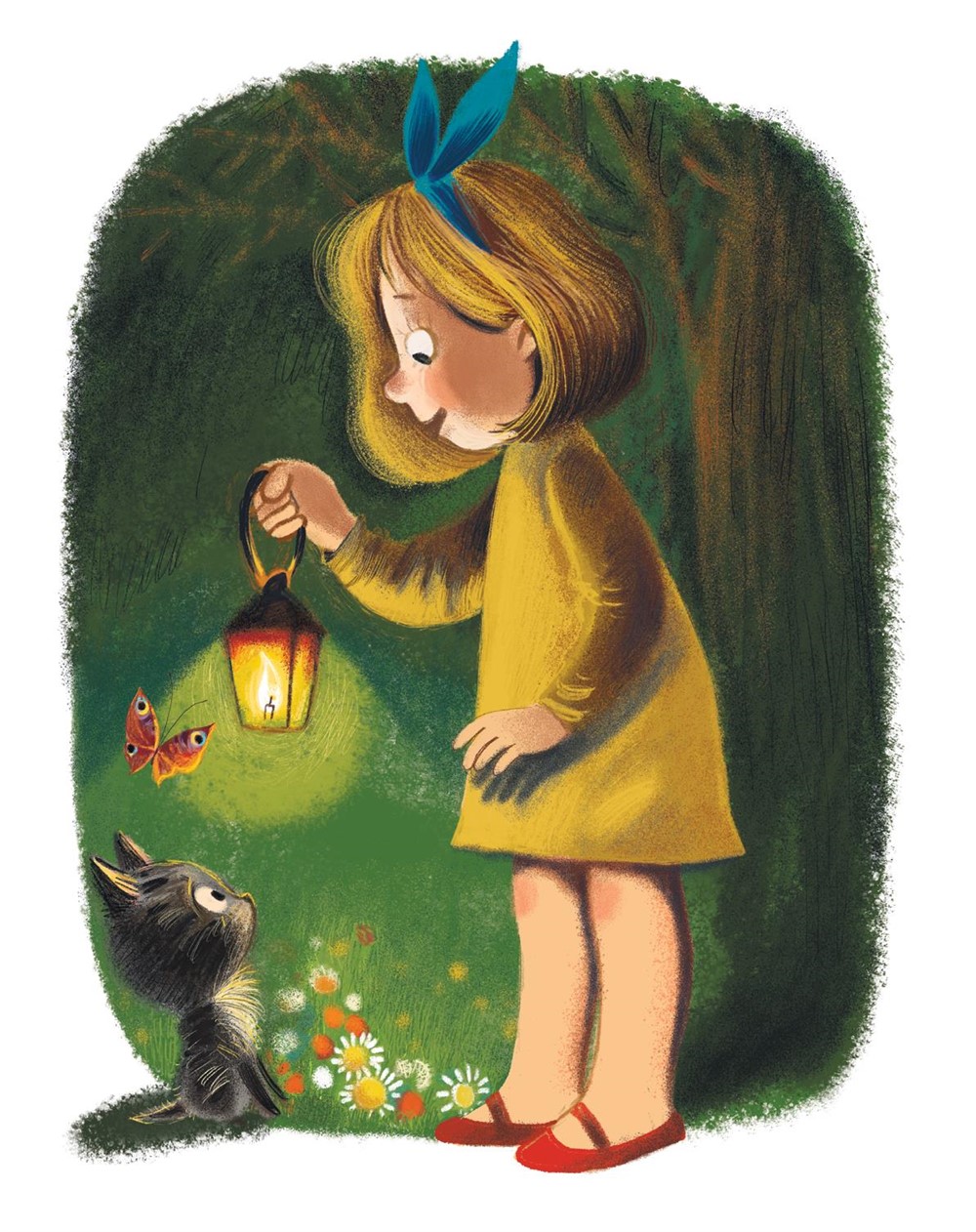 Вдруг заметил Полосатый котёнок жёлтый огонёк среди деревьев. Это шла Маша. А фонарик она взяла у Лесного Гнома.