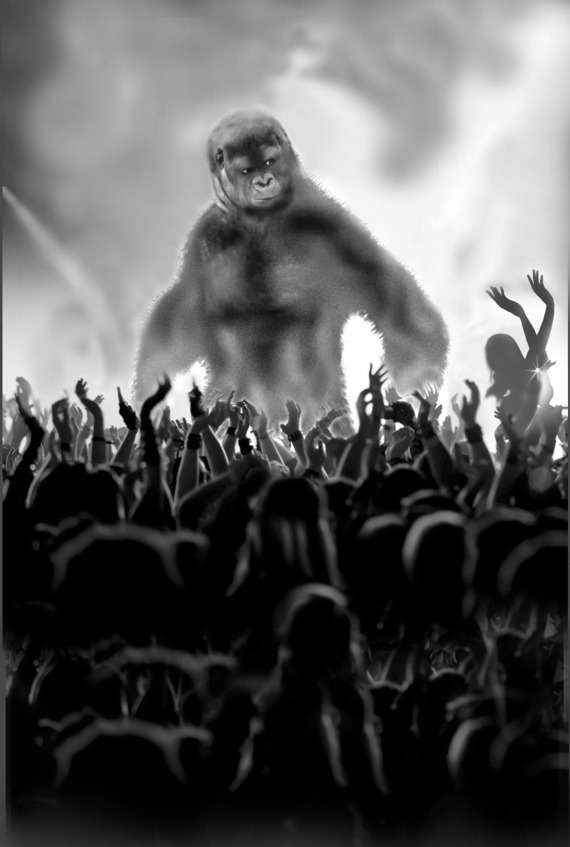Не в толчее, а НАД толчеей! Короче, над всем этим стадом танцующих гигантским фиолетовым маревом вздымалось нечто странное. Не облако, не сигаретный дым, а та самая фигура. Сутулая, мешковатая, полупрозрачная. Мощные покатые плечи, какой-то неряшливый ворс по телу (голый он, что ли?), длинные толстенные руки и шишковатая голова. Точно поднялся на задние лапы орангутанг. Только разика в два покрупнее.