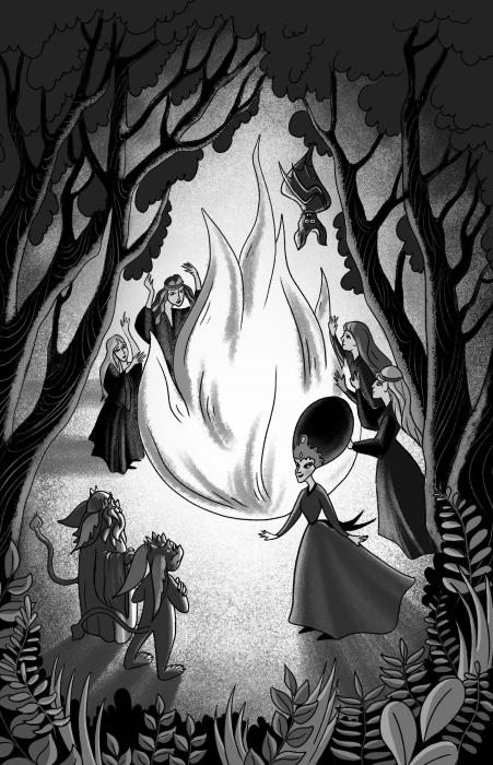 Стоило гремлинам выйти из-за деревьев, как все пять ведьм обернулись к ним, но от группы отделилась только одна, четверо других остались у костра.