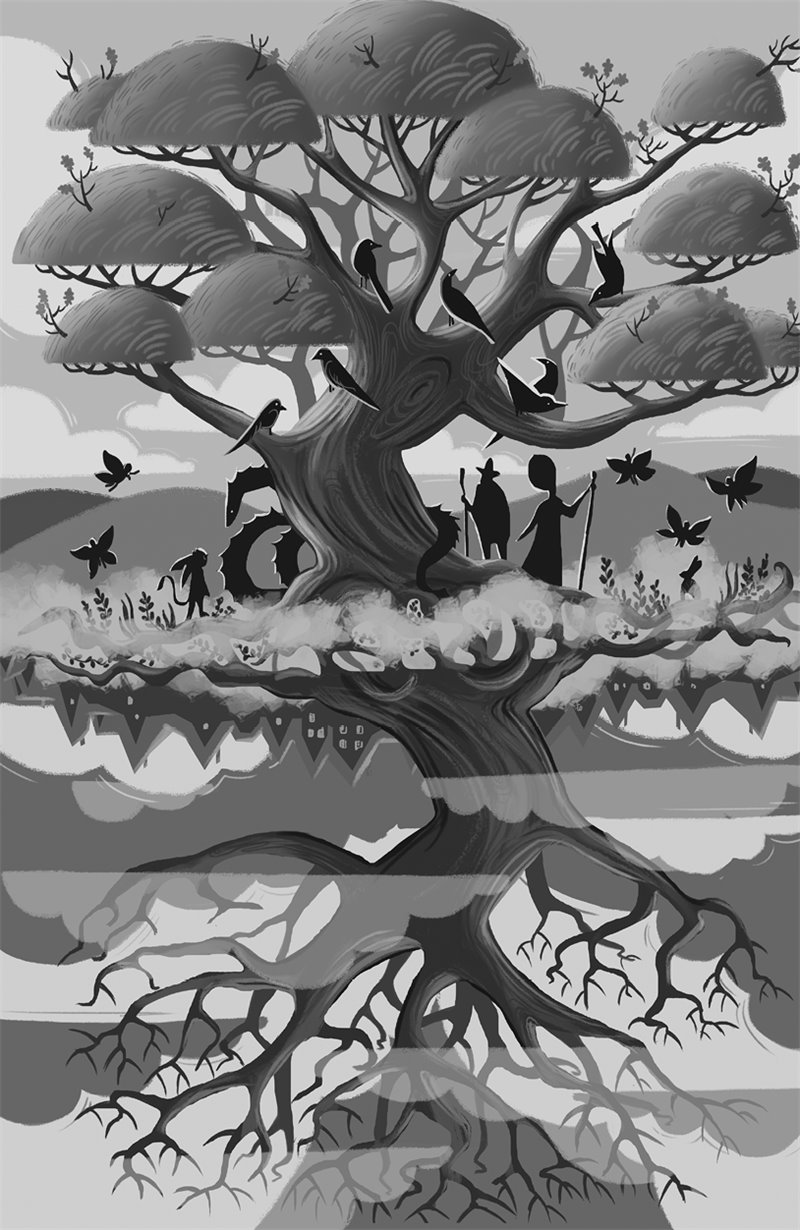 Так и стоял дуб, словно царь, одинок и страшен, раскинув в разные стороны огромные кривые ветви. Со временем вокруг вырос дремучий лес. Стоит этот дуб и по сей день. Да и куда ему деваться, ведь он соединяет два мира! На нашей земле он сухой почерневший великан, вшестером не обхватишь. И никому невдомёк, что из корней его растет ещё один дуб – с другой стороны земли. Вы картинку на игральной карте видели? Вот так и растёт. Поверни картинку нашим дубом кверху – мы головой вверх стоим, а тот мир ногами по потолку ходит. Поверни в другую сторону – тот народец по лужайкам бегает, а мы на головах стоим.