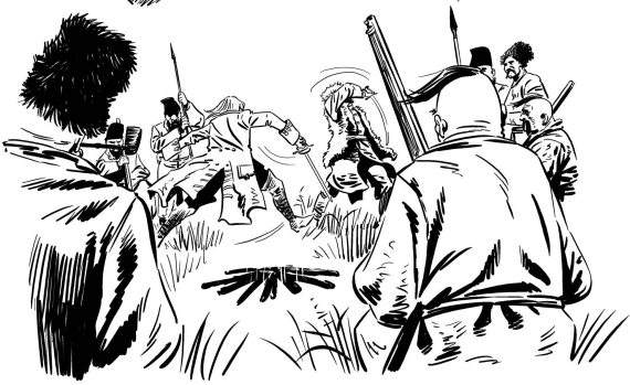 Вожжову достался главарь. Две мощные фигуры сошлись в смертельной схватке, силы были равными, но товарищи Вожжова уже вышли победителями – слишком внезапным для бандитов стало их нападение. Они окружили сражавшихся. Главарю ничего не оставалось, как прекратить бой и прижаться спиной к единственному оставшемуся в живых соратнику – калмыку Яцуре. Но даже в такой не самой выгодной для себя ситуации разбойники не думали сдаваться. Они держали оружие наготове и ждали нападения, как ощетинившиеся тигры. Порядком подуставшие драгуны не спешили начинать схватку. И тут раздался гортанный крик вожака: