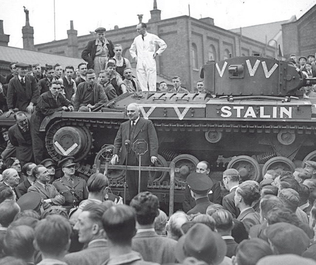 Посол СССР в Великобритании И. М. Майский выступает на торжественном митинге на заводе фирмы Birmingham Railway Carriage and Wagon Company в Бирмингеме (Birmingham), посвященном передаче Советскому Союзу первых танков по программе ленд-лиза. Сентябрь 1941 года