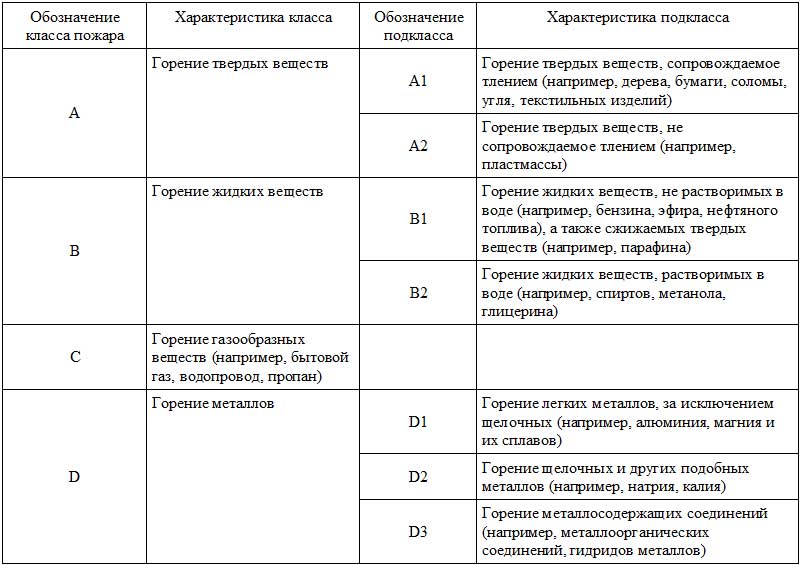 Пожары классифицируются по виду горючего материала и подразделяются на следующие классы: