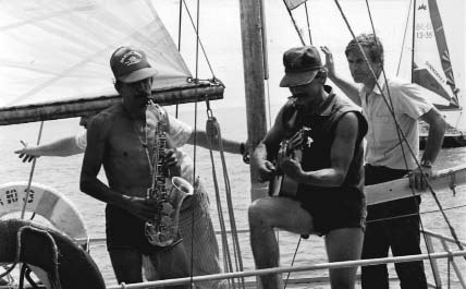Провожали «Лену» из Махачкалы погожим утром 7 июля. При легкой моряне, здешнем юго-восточном ветре, из гавани судоремзавода вслед за ней вышло несколько катеров и яхт. На одной объявился маленький оркестрик из саксофона, гитары и ударника, сыгравший «Прощание славянки» (на фото справа). Гвоздев ответил несколькими ракетами и поднятыми над головой сцепленными руками. Мол, прорвусь! Когда эскорт вывел «Лену» за волнолом, последнее, что увидели провожающие, была оранжевая панама, которую моряк взгромоздил себе на голову. Он шел в тропики, а без панамы там нельзя. И первое, что сделал Гвоздев и чего провожающие не заметили, – пристегнулся карабином к фалу. За четыре года это стало потом настолько привычным, что не пристегнутым он неуютно чувствовал себя даже на суше.