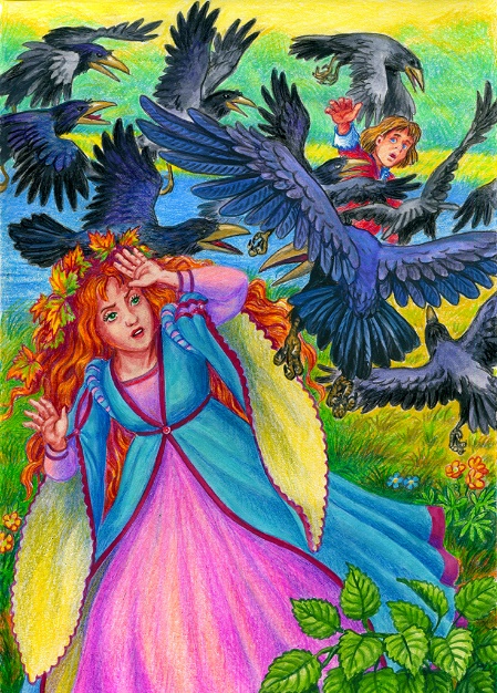 И вот однажды, когда Королевич ожидал возле ручья, а Осень уже спешила к нему, протягивая руки, налетели черные вороны, стражи Разлуки, подхватили Королевича и прямо на глазах обезумевшей Осени унесли его за дальние дали, за высокие горы – в Хрустальный замок Разлуки.