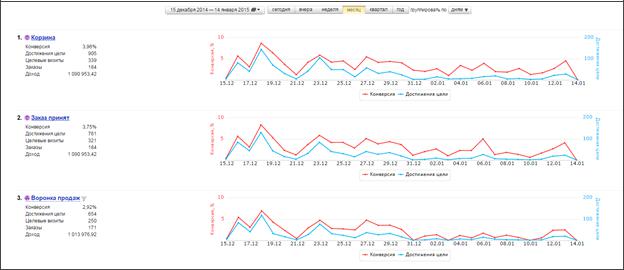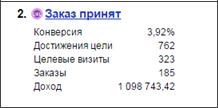 в которой отображается показатель конверсии сайта, количество достигнутых целей, количество целевых визитов, заказов и общий доход за указанный период времени.