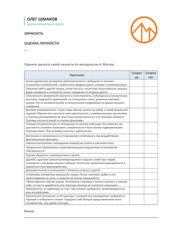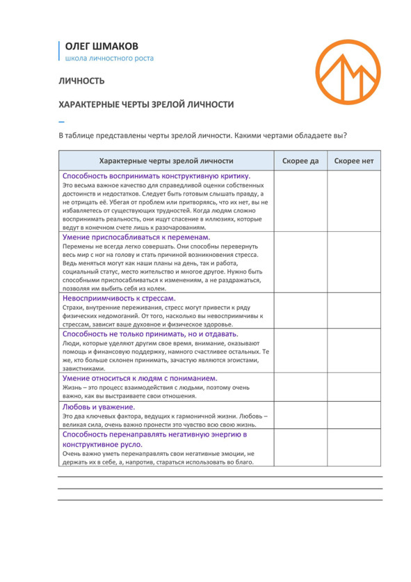 На первом шаге проведем аудит вашей личности на зрелость. Я покажу вам, какое значение зрелость личности оказывает на личную эффективность и успех в жизни.