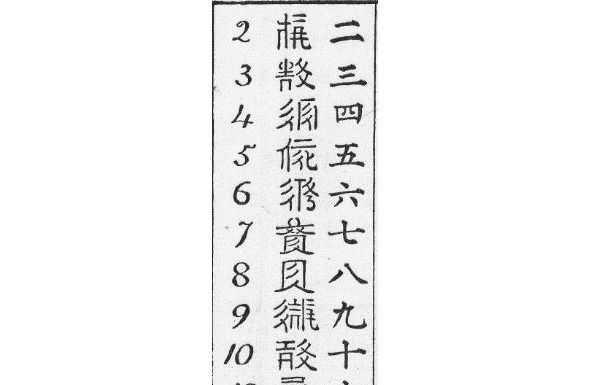 Тангутские числительные (центральный столбик). Правый столбик – китайские и японские числительные.