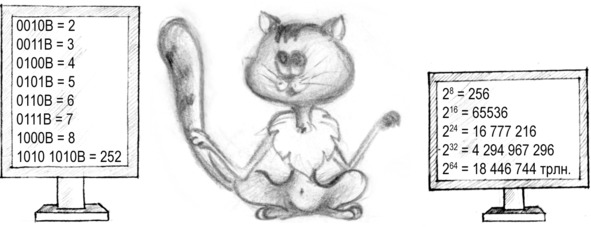 «Управление компьютерами, как известно, основано на двоичной системе счисления. Это связано с тем, что в электронных схемах ток или есть, или отсутствует. Таким образом, в числовом выражении, возможны только два значения – ноль и один. Минимальная единица измерения информации называется бит, который и принимает эти значения. Двумя битами можно обозначить четыре числа 00, 01, 10, 11. Тремя битами кодируется восемь чисел, а четырьмя уже шестнадцать. Два в соответствующей степени дает число возможных вариантов. Следующую единицу измерения информации решили сделать равной восьми битам и назвать ее байт. Два в восьмой степени равняется 256. Кстати, двумя байтами можно закодировать 65536 вариантов, а тремя байтами более 16,7 миллионов.»