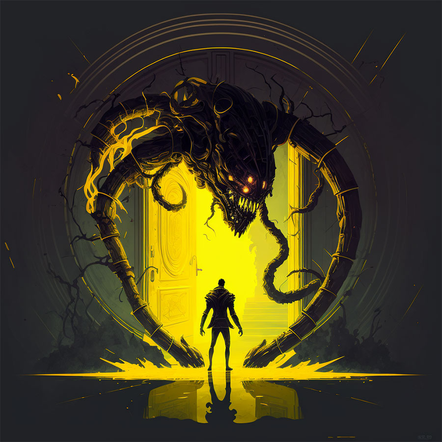 В следующий момент, он подлетел к вращающейся в воздухе голове и схватив за один из монструозных зубов, потянул за собой. Направился он к бурому провалу в черноте, что вёл в его мир.
