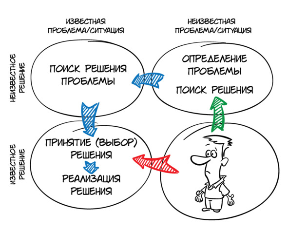 И наконец четвертый квадрант: неизвестная проблема – известное решение. Представьте, что вы, нарушив неизвестные вам правила дорожного движения, не понимая, что именно нарушено и не зная языка, попробовали привычно вручить полисмену купюру. Один из моих приятелей, будучи в Лиссабоне, проделал это и избежал крупных неприятностей только чудом. Самая парадоксальная и вместе с тем самая обыденная ситуация – то, что встречается в организации повсеместно. Как говорится, если у ребенка в руках молоток, очень многое в доме может стать гвоздем.